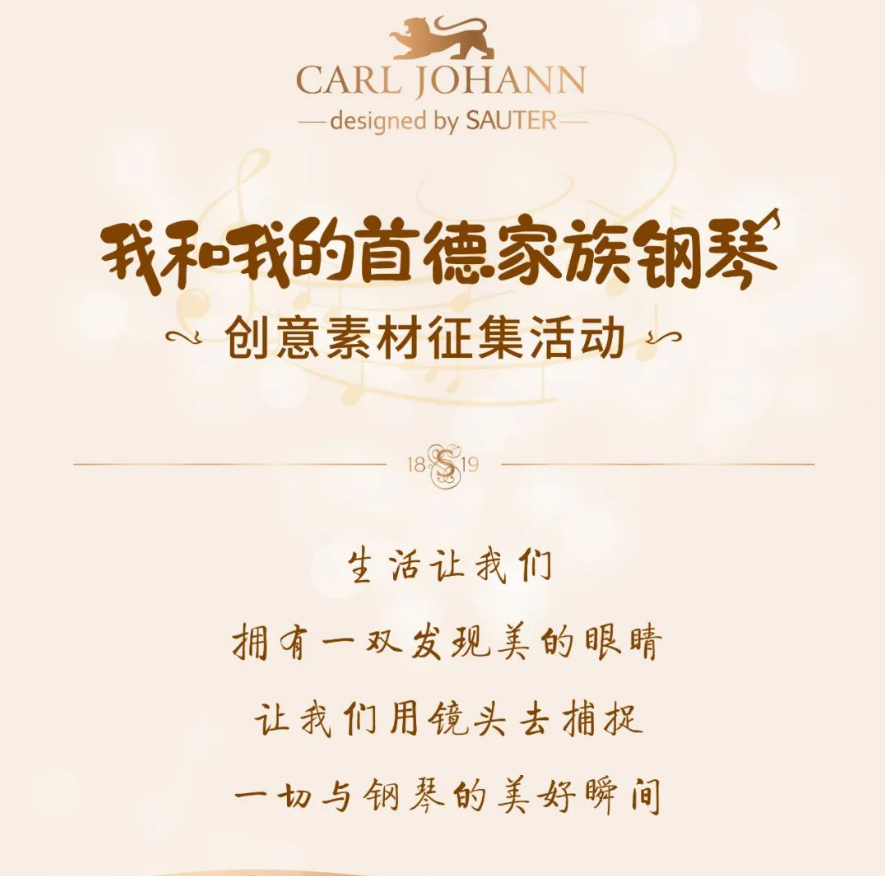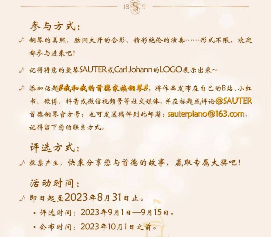 ④添加話題 #我和我的首德家族鋼琴# 發(fā)表在您的個(gè)人社媒頻道,并在標(biāo)題或評(píng)論@首德鋼琴官方號(hào);或也可發(fā)送稿件到此郵箱:sauterpiano@163.com,記得留下您的聯(lián)系方式。